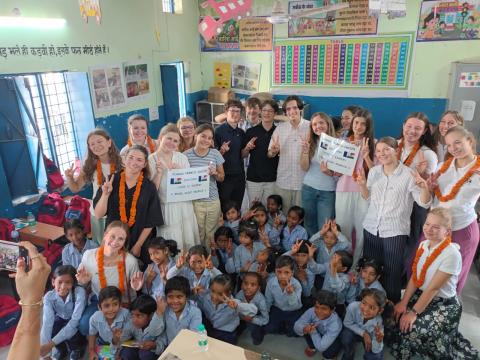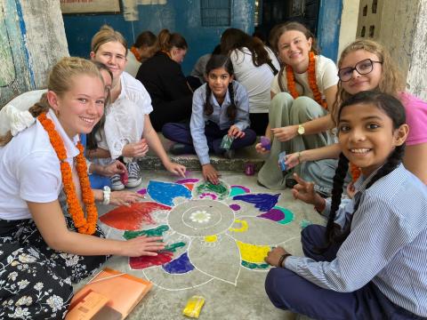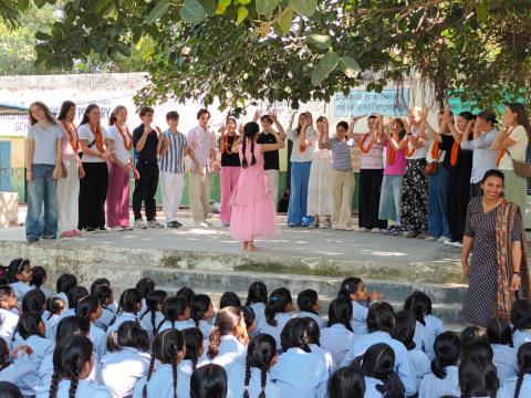 🏫 Pour mieux comprendre le système éducatif indien, nous avons visité une école publique pour jeunes filles âgées de 5 à 11 ans, issues de milieux défavorisés. Nous leur avons présenté quelques chants et danses, et avons été touchés par leur écoute, leurs sourires et leur joie de vivre, malgré des conditions d’apprentissage rudimentaires. À cette occasion, nous avons pu offrir des fournitures scolaires aux plus jeunes, qui n’avaient probablement jamais eu leur propre pochette de crayons de couleur. Grâce à l’art, la communication a été possible, même sans langue commune. Elles nous ont notamment initiés aux rangolis, une forme d’art traditionnelle réalisée avec du sable coloré pour célébrer Diwali, la fête des lumières.